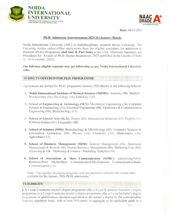 Noida International University (NIU) is a multidisciplinary, research-driven University. The University invites online/offline applications from the eligible candidates for admission to the doctoral (Ph.D.) Programme as per UGC Minimum Standards and Procedures for Awards of Ph.D. Degree Regulations, 2022, published in the Gazette of India on 7th November, 2022.